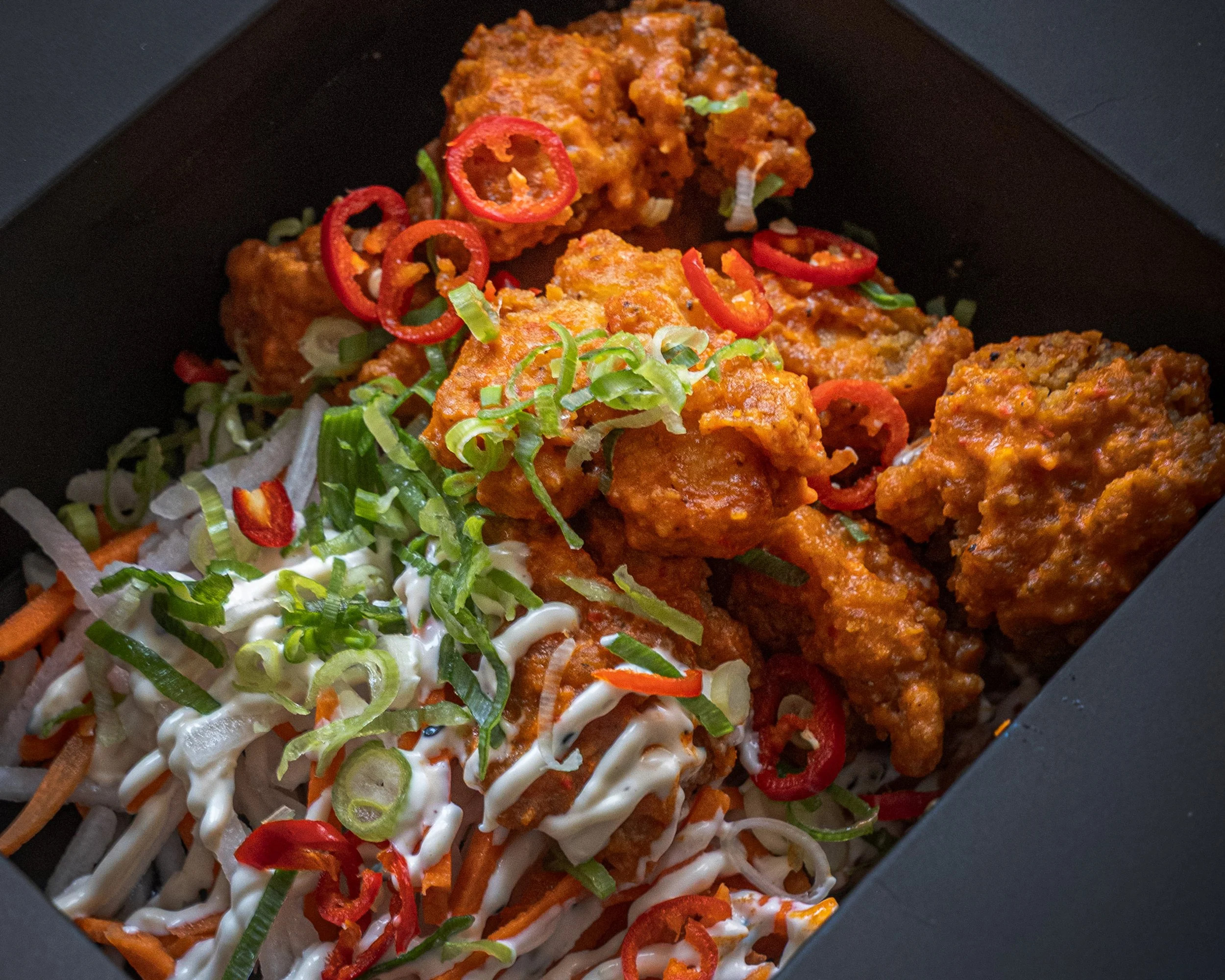 Serveras med vår egna buffalo hot sauce och krispig sallad med rättika/morot och sesammajo