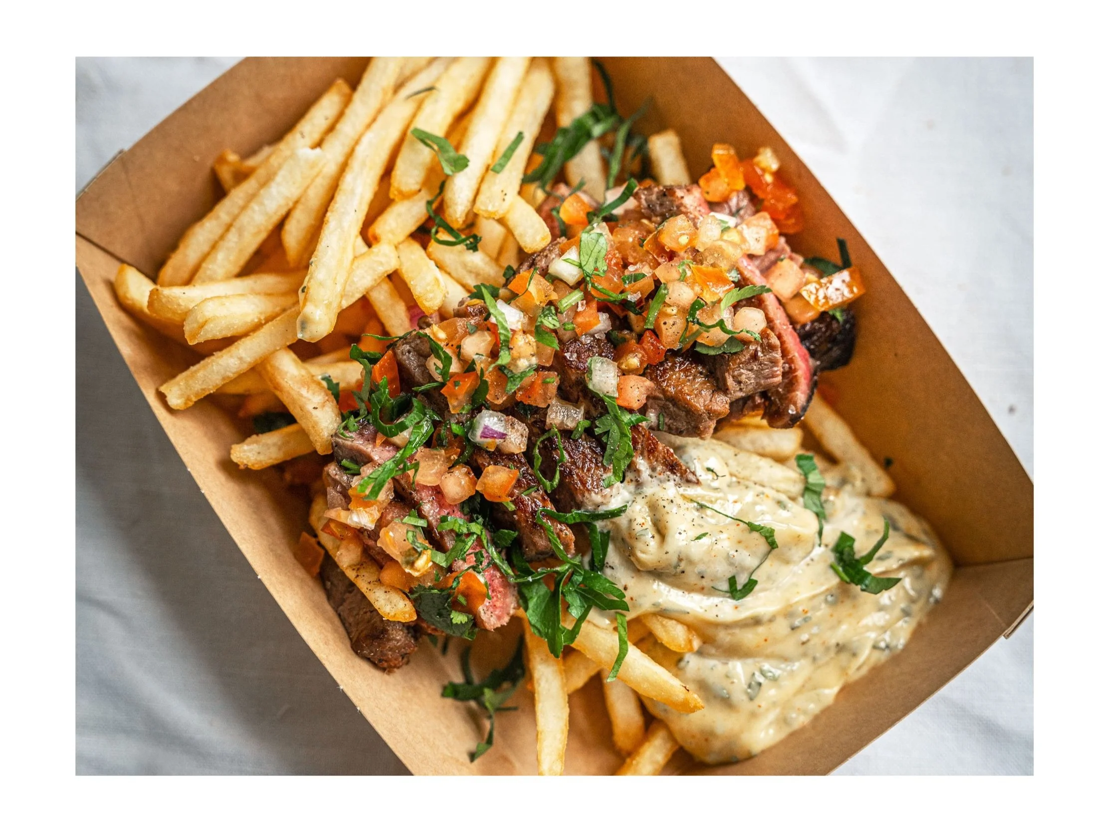 Biff (Flankstek), pommes, tomatsallad och bearnaisesås. Pris 200 kr per portion + 5000 kr/etableringskostnad.